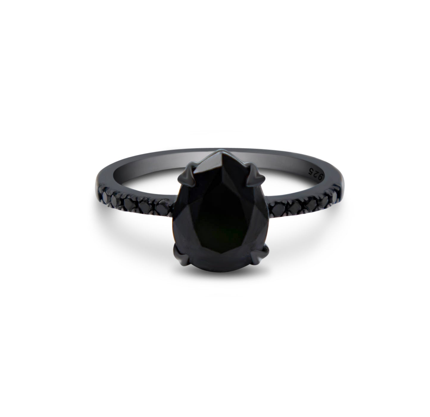 Está hecho a mano, creada en plata .925 (ideal para pieles sensibles con reacciones alérgicas) bañado en oro negro de 14K. Su gema principal y laterales son Espinelas negras naturales, la cual se encuentra en los mismos depósitos en Sri Lanka que los zafiros y rubíes.